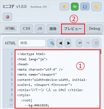 まずは以下のボタンを押すとブラウザの別タブでミニコデが開きますので、開いたまま読み進めてください。