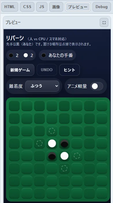 これで、画面上に自分で作ったリバーシが表示され、すぐにプレイすることができます。