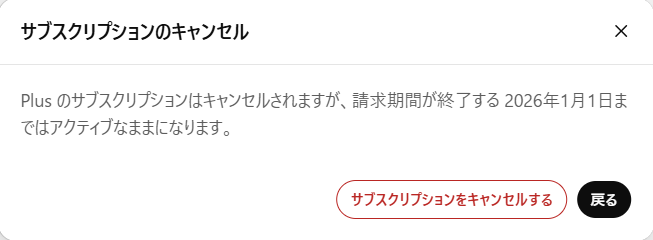 解約手続きが正しく終わると、「2026年1月2日に自動更新されます」という表示が、「ご利用中のプランは2026年1月1日にキャンセルされます」といった表現に変わります。