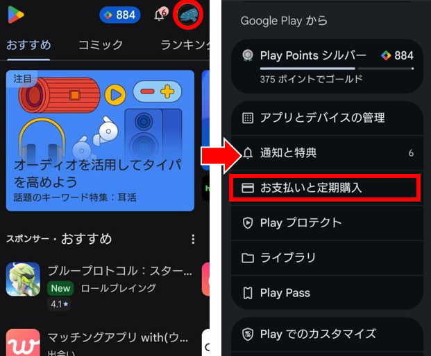 右上のプロフィールアイコンをタップ、お支払いと定期購入を選択