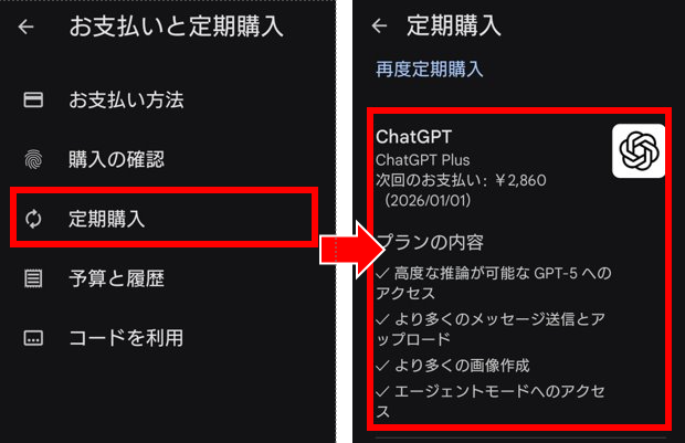 定期購入をタップして、定期購入からChatGPTを選ぶ