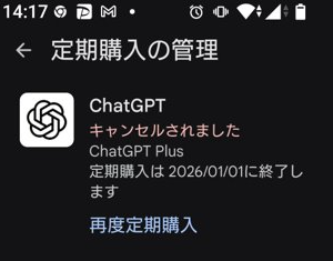 Playストア経由で課金している人は、ChatGPTのアプリ内を探しても解約ボタンは見つかりません。Google先生の庭で手続きしましょう。