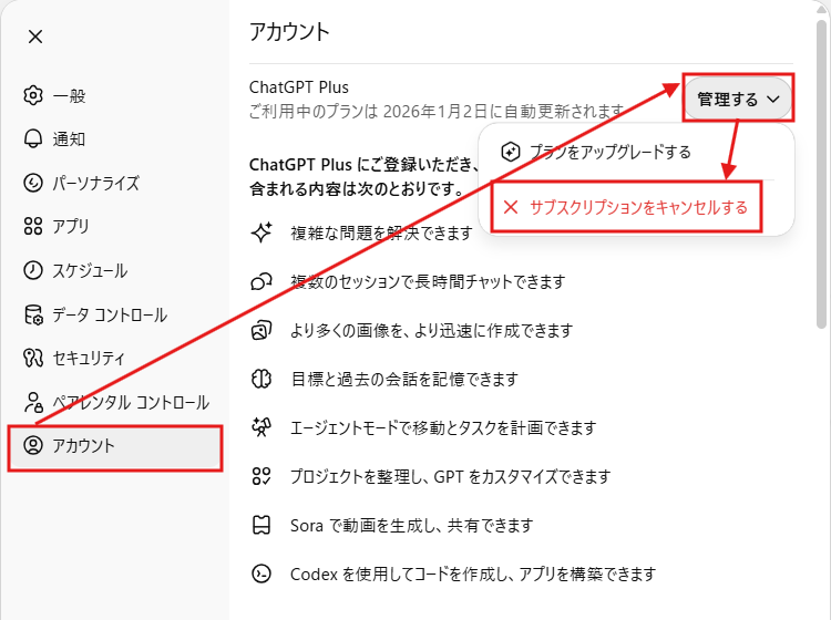 アカウント > 管理 > サブスクリプションをキャンセルするを選択