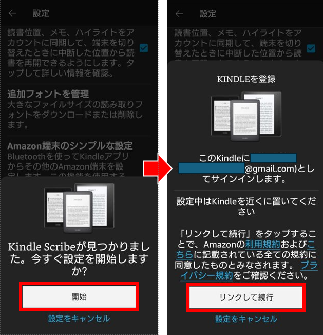 もう一つの「このKindleで設定」はアカウント(メールアドレスとパスワード)を入力して設定する方法です。