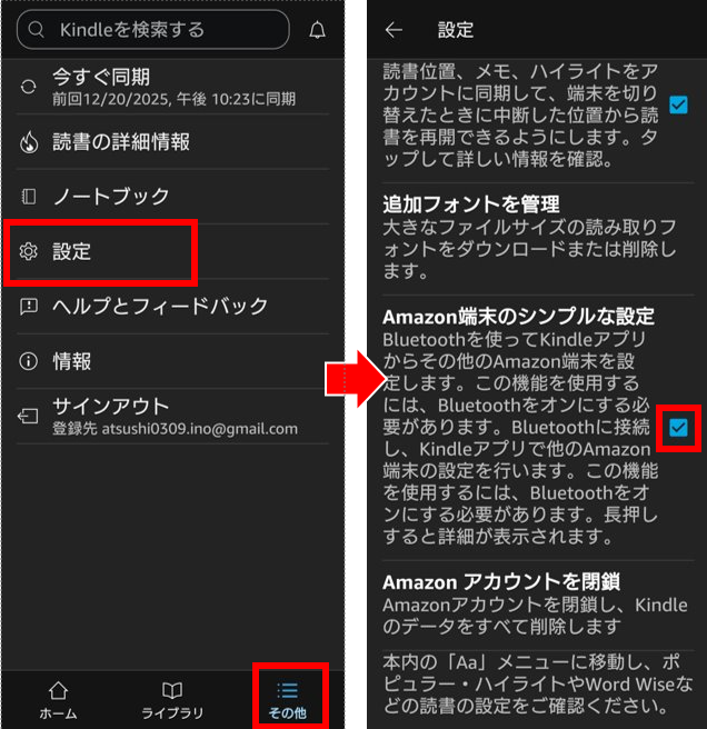 上記の画面が出たらスマートフォンのKindleアプリを開いて、その他>設定>Amazon端末のシンプルな設定にチェックを入れます。
