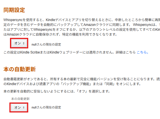 設定タブを選択すると下の方に「同期設定」「本の自動更新」という設定があるので、両方ともオンになっていることを確認してください。